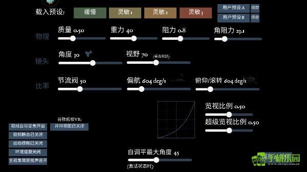 3、例如对物理质量、灵敏度、重力、助力、角阻力等参数进行设置;