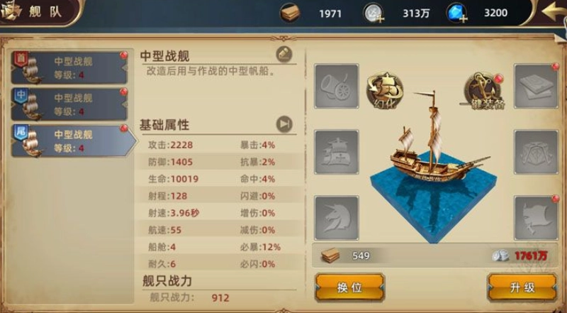 舰船的养成主要围绕升级、装备(强化)与幻化三个维度展开:升级需消耗木板、银两等材料;幻化本质是舰船的皮肤系统,激活后不仅能获得基础属性,还可叠加所有皮肤的强化属性加成。其中颇具特色的是装备系统,舰船装备涵盖炮台、风帆、货仓、防弹甲等配件,不同船装对应独特的属性与功能增益——例如货仓在提升防御能力的同时,还能增加货物携带量,为海上贸易提供便利。玩家通过搭配不同船装,可让战舰呈现出多样化的功能特性与战斗流派。