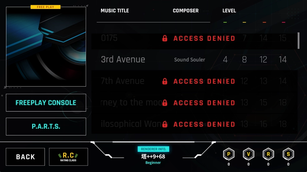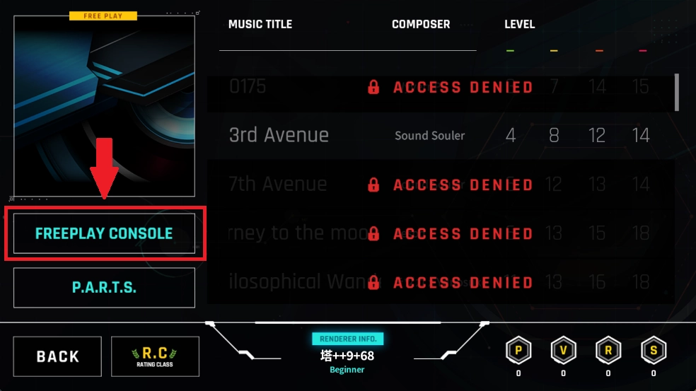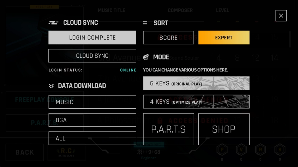 3、点击左侧的FREEPLAY CONSOLE,可进行登录、查看数据、调整歌曲难度、选择键位数量以及进入商店等操作。