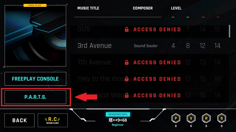 4、点击左下角的P.A.R.T.S按钮,能够更换打歌界面里的按键、滑轨以及点击特效等外观元素。