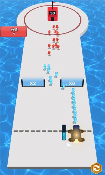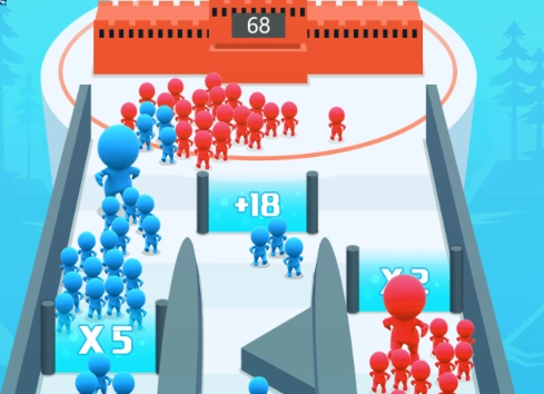 操控小人左右跑酷,躲避各式各样的攻击,穿过蓝门提升数量,最终击败红门。