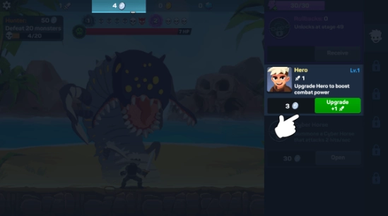 3、击败怪物,招募并升级新英雄,以此解锁新的闲置能力。