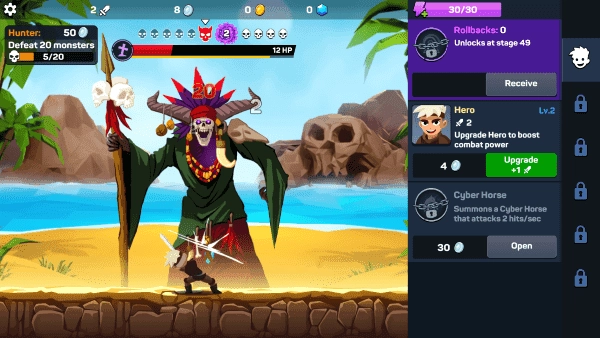 2、积累财富以提升你的英雄等级和解锁新的闲置技能。击败黑暗势力,让这片土地重归和平。