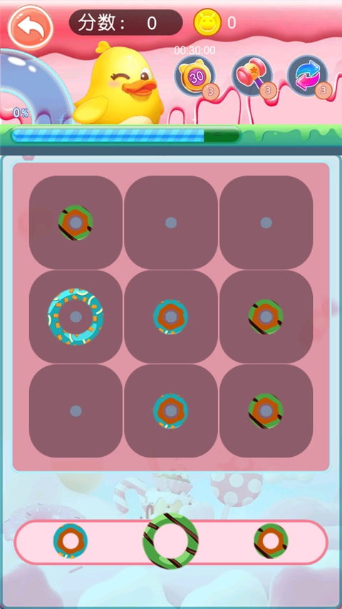 《甜甜圈消消乐》是一款充满趣味的消除类游戏,玩家需要把各种形状、颜色的甜甜圈放入九宫格内来完成消除操作。游戏规则十分简单:既可以将相同颜色的甜甜圈在横向或纵向连成一排进行消除,也能把大、中、小不同尺寸的同色甜甜圈叠放在同一格子里实现消除,整个过程十分考验玩家的策略规划与思维能力。