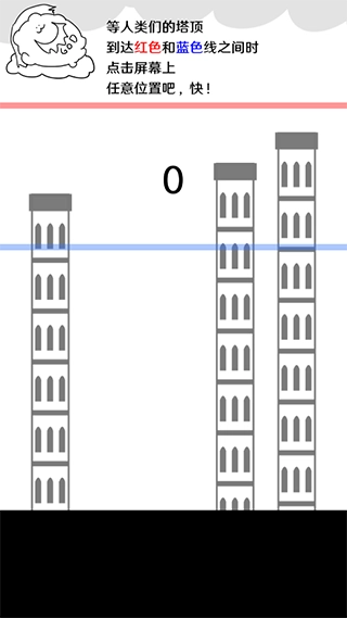 玩家只需点击塔顶,使其停在红蓝线之间即可获得分数。塔的高度越高,得分就越多,若能紧贴红线,最高可获得100分。此外,蓝线会逐渐上升,塔的速度也会发生变化,游戏难度将随之增加。
