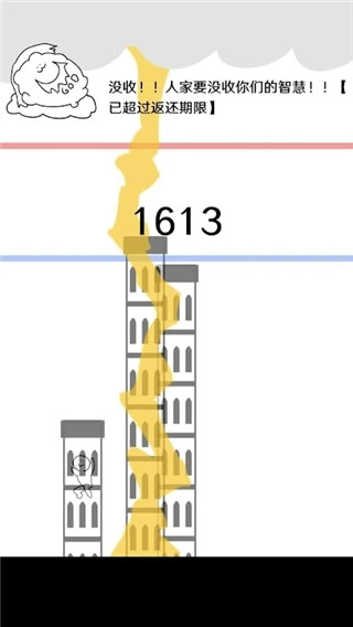 4、当人类搭建的塔顶触及红色线时,游戏即宣告失败,同时会展示玩家的分数记录。