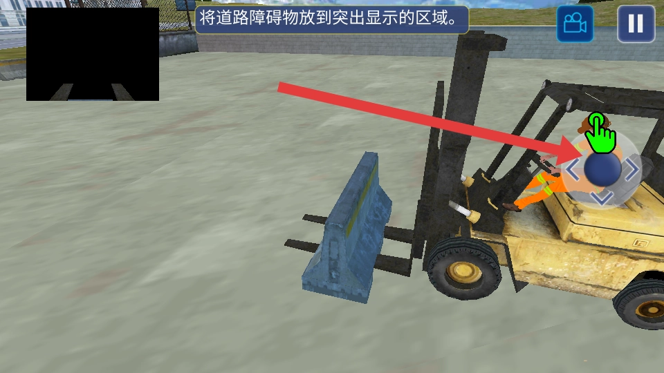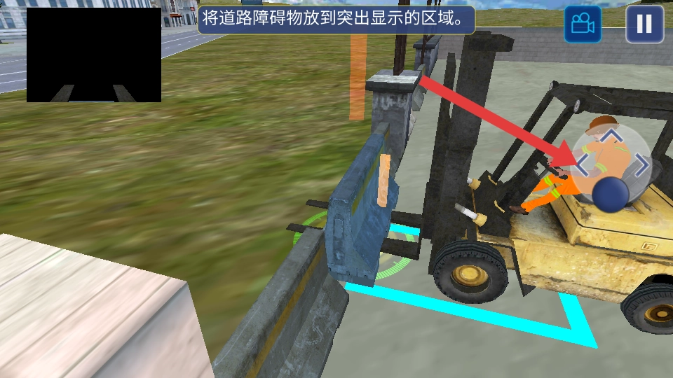 2、完成停车操作后,切换至搬运道路障碍物的任务,操控叉车将障碍物叉起,并精准放置到蓝色框内,以此完成搬运作业。