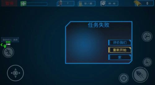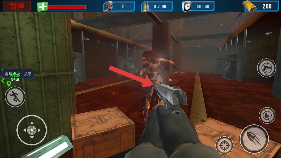 进入工厂场景后,通过左侧摇杆控制移动,用枪械瞄准并射击丧尸,过程中要注意上方的生命值显示以及任务进度的变化。