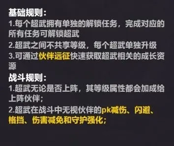 2. 超武在战斗过程中,伙伴的pk减伤、闪避、格挡、伤害减免以及守护强化效果均对其无效;