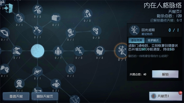 回光返照是最右侧的天赋,玩家们常叫它“大心脏”。当五台密码机都破译完毕后,这个天赋就会被触发,具体是在最后一台密码机破译完成的瞬间生效。它能让所有携带该天赋的求生者回复1点生命值,同时获得持续5秒的50%移速加成。基于这个特性,《第五人格》里还衍生出了“压机”这个专属玩法名词。