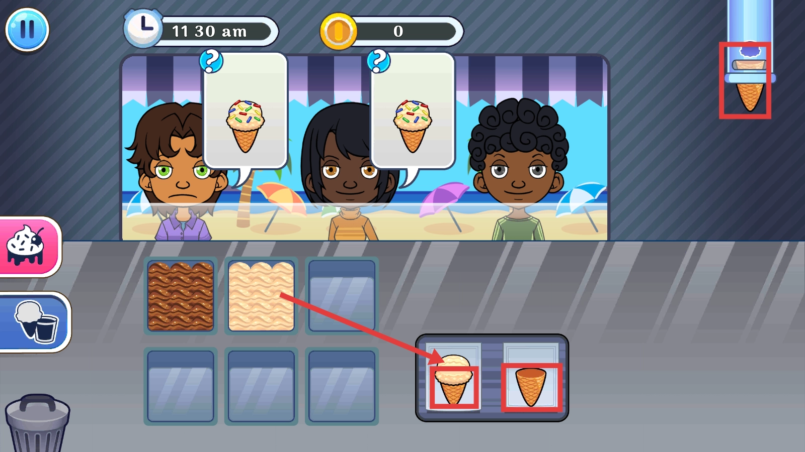 2、首先从右侧的机器里取出蛋筒,接着搭配上冰淇淋,这样就完成了冰淇淋的基础组合。