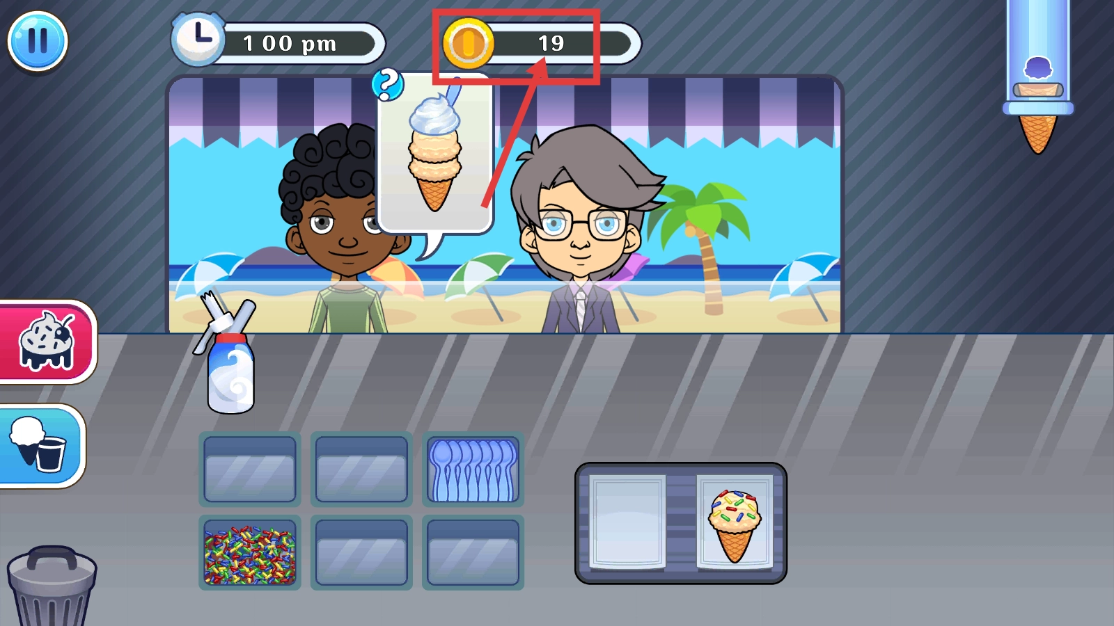 完成订单后可获得金币(例如积累到19金币),这些积累的金币可用于店铺升级或者解锁新的食材。