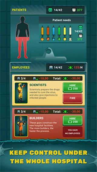 为了更有效地治疗您的患者,您得聘请具备专业资质的人员!依据您的发展规划去招募和解雇各类专家,并且为他们配备顶尖的医疗设备。护理人员、科学家、治疗师、建筑工人以及门卫——这些不同岗位的人员都至关重要。每个人都要为完成对抗感染这项艰巨任务承担责任。