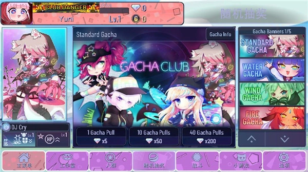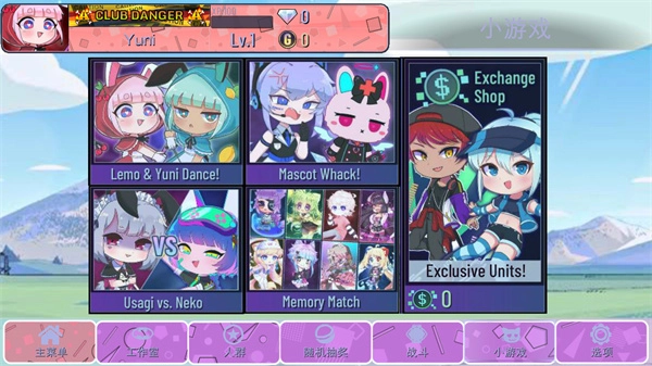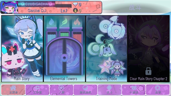2、进入游戏后,你会看到主菜单、工作室、人群、随机抽奖、战斗、小游戏等功能模块。