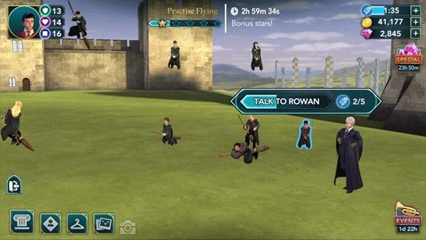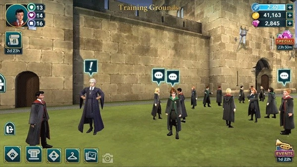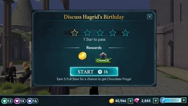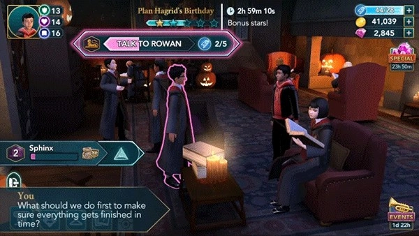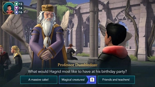 1、本次演练会以一名二年级学生的视角来介绍游戏。考虑到一年级及以上的学生都能参与冒险活动,所以依据你当前主要故事的推进情况,部分任务的星级与属性要求或许会存在差异。等你抵达那里后,就能和一些学生进行互动了。点击他们头顶的对话气泡,看看他们想对你说些什么。随后,邓布利多会告知你海格的生日即将来临,他希望你帮忙筹备一场惊喜派对。