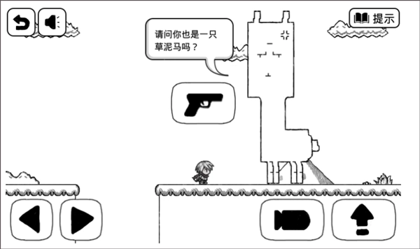 4、到达最后的平台后,会出现一只巨大的草泥马。这里的操作技巧是将手枪图标拖动到游戏界面内,然后点击发射炮弹,这样就能击败草泥马,顺利通过此关。