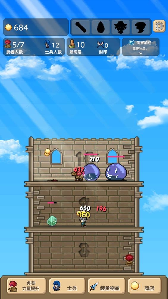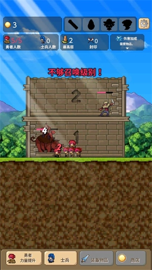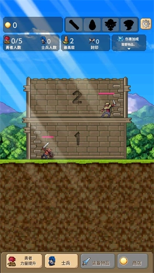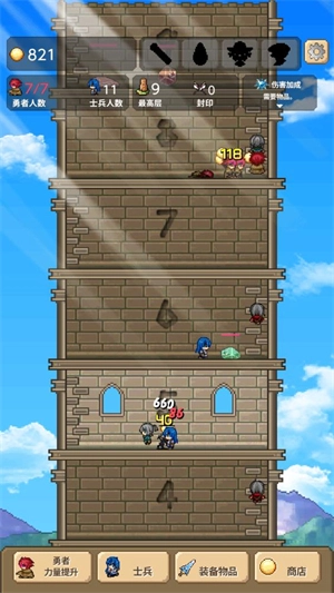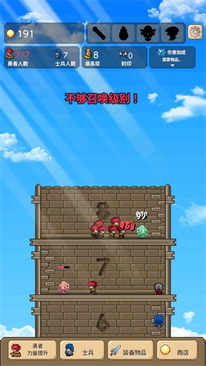 5、持续召集更多的勇者与士兵,一同去战胜高塔中的怪物,不断向上攀登高塔,直至消灭所有敌人。