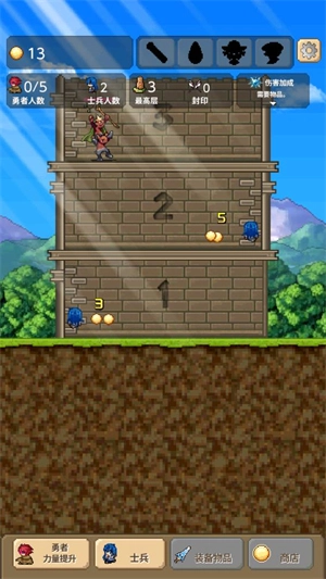 4、战胜每一层的怪物都能得到金币奖励,点击下方的勇者和士兵,就能花费金币提升他们的等级,从而增强战斗力。