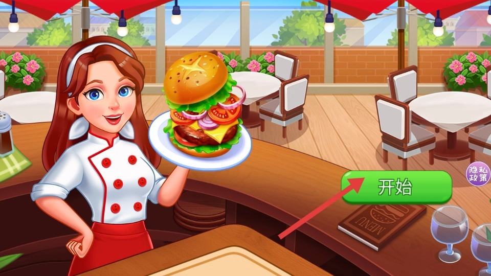 1、点击绿色的【开始】按钮,进入餐厅经营的场景,跟着厨师的指引,开启美食制作和服务的流程。