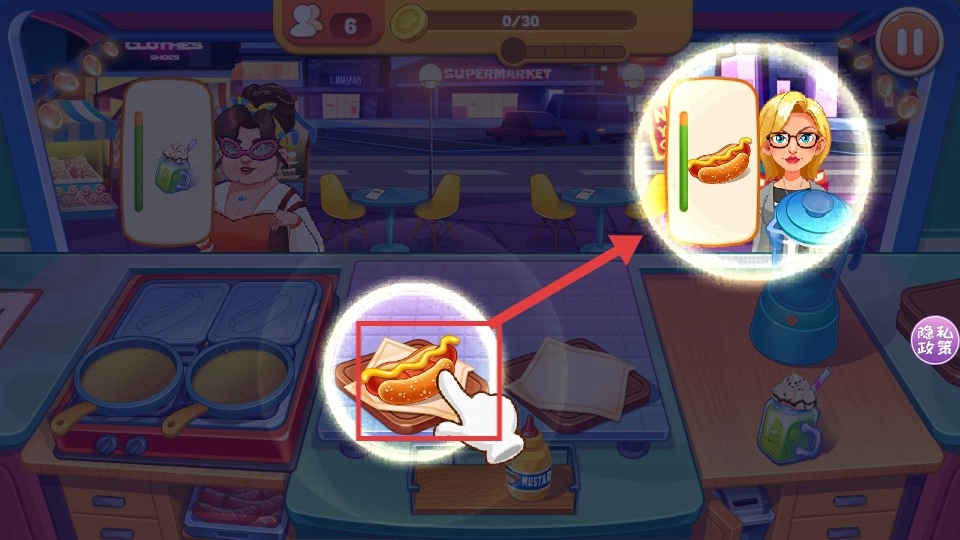 3、把制作完成的热狗,按照右侧顾客的热狗订单进行交付,以此完成订单并获取收益。