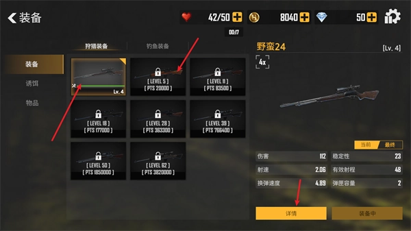 页面上会呈现各式各样的狙击武器,你可以挑选自己想要升级的装备,然后点击详情查看。