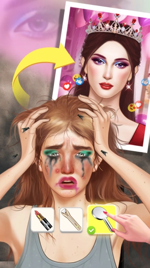 进入游戏后,先借助工具去除人物脸部的痘痘之类的瑕疵,完成3个相关处理任务后,点击粉色的播放按钮就能进入下一环节,开展皮肤护理等操作,等所有护理步骤都完成了,角色便会升级。