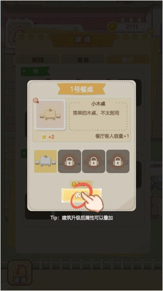 4、接下来继续点击建造中的小木桌,以此来完善自己的餐厅就可以了。