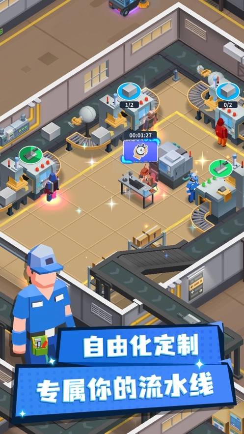 2、收集各类矿场资源用于兑换,用心培养员工并安排新的培训任务,升级后勤团队以保障工厂整体运转,打造属于你的钢铁帝国近在眼前。