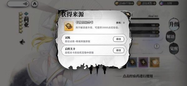 将所收集到的资源进行装入,可以进行升级、觉醒、解语。升级是通过搜集的手稿进行(有初级中级高级特级之分,经验点分别是100、1000、5000、30000)升级后其攻击、生命力、物理法术防御皆会增强;