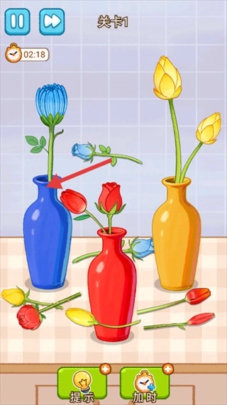 1、在关卡1中,将花朵整理到对应颜色的花瓶中,完成插花任务。