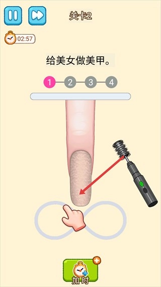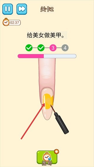 3、在关卡2“给美女做美甲”任务中,按照提示步骤,先处理指甲。