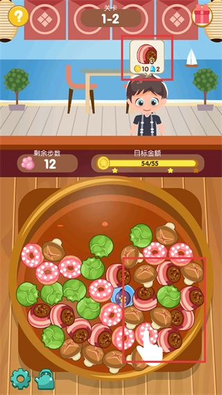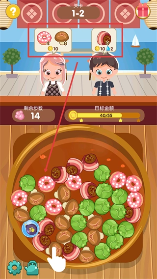 1、收集【甜甜圈】和【蘑菇】,快速积累金额,剩余步数充足时可兼顾其他食材完成目标。