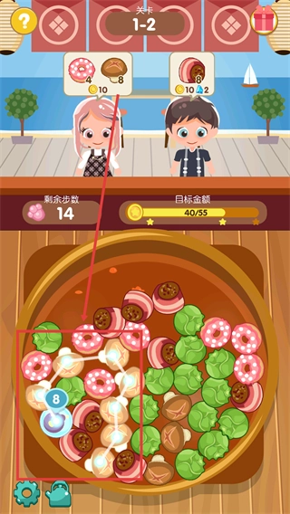 游戏中您拥有一家火锅店,客人纷纷前来光临,您需要满足客人的需求,在火锅中找到客人需求的食物然后拖动手指连接3个以上的相同食物即可完成一次消除,完成客人的需求获得金币,并升级您的店铺和技能,使您经营的店铺日益壮大。