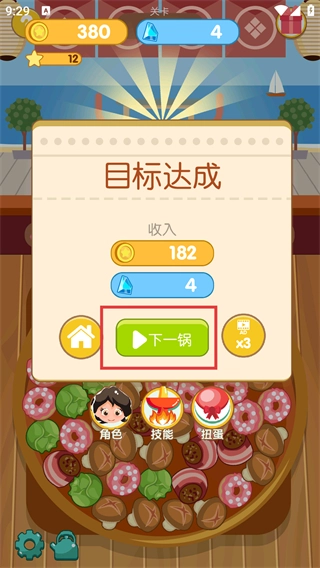 4、目标达成后,点击【下一锅】按钮继续游戏,为后续关卡储备资源提升效率。