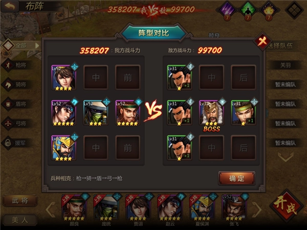 敌军的武将布阵是“前1前3中1中3后2”,我方的布阵为“前1、前3、后1、后2、后3”。考虑到弓将通常血量较低,因此在阵前排兵两个盾将,为后排的弓将抵御伤害。