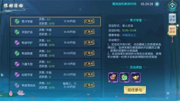 除了常规途径外,参与特定时段的活动也是获取资源的好方法。例如,每天下午四点有双倍护送活动,半小时后则是九天魔王活动。另外,部分活动支持一键预约功能,在限时活动界面设置后,到点会自动提醒,建议大家尽量参与,这些活动能提供额外的经验和奖励。