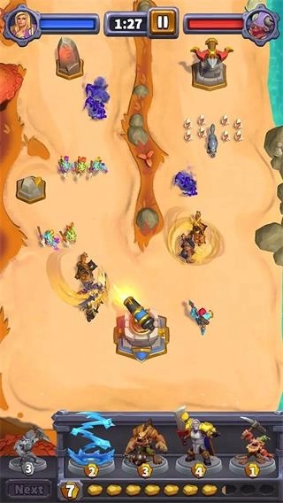 玩家需要运用策略在战场上部署战士,对局过程中会积累金币,还能通过采矿获取宝箱和财宝。要灵活利用守卫塔、集合石等资源把控地图局势,以便把单位安置在更恰当的位置。占领集合石或防御塔的作用在于:一旦成功占据这些地点,就能在离Boss更近的区域布置随从,类似RTS游戏里把兵营建在对手家门口的思路;反之,若被敌方抢占,自身就会陷入危险境地。