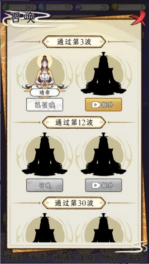 启动游戏后,会持续出现邪祟侵扰,玩家需要布置阵局、召唤强者进行抵御。