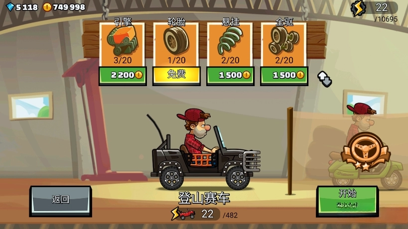 新手会送一辆吉普车,这辆车的性能实在不怎么样。你可以开着它反复跑田园地图,或者实在受不了就换车,等攒够金币就能买下一辆车——越野摩托车了。越野摩托车的性能非常出色,足够你玩很长一段时间。不过你得记得提升越野摩托车的各项性能,期间如果有兴趣还可以解锁沙漠、北极、高速公路等其他场景。