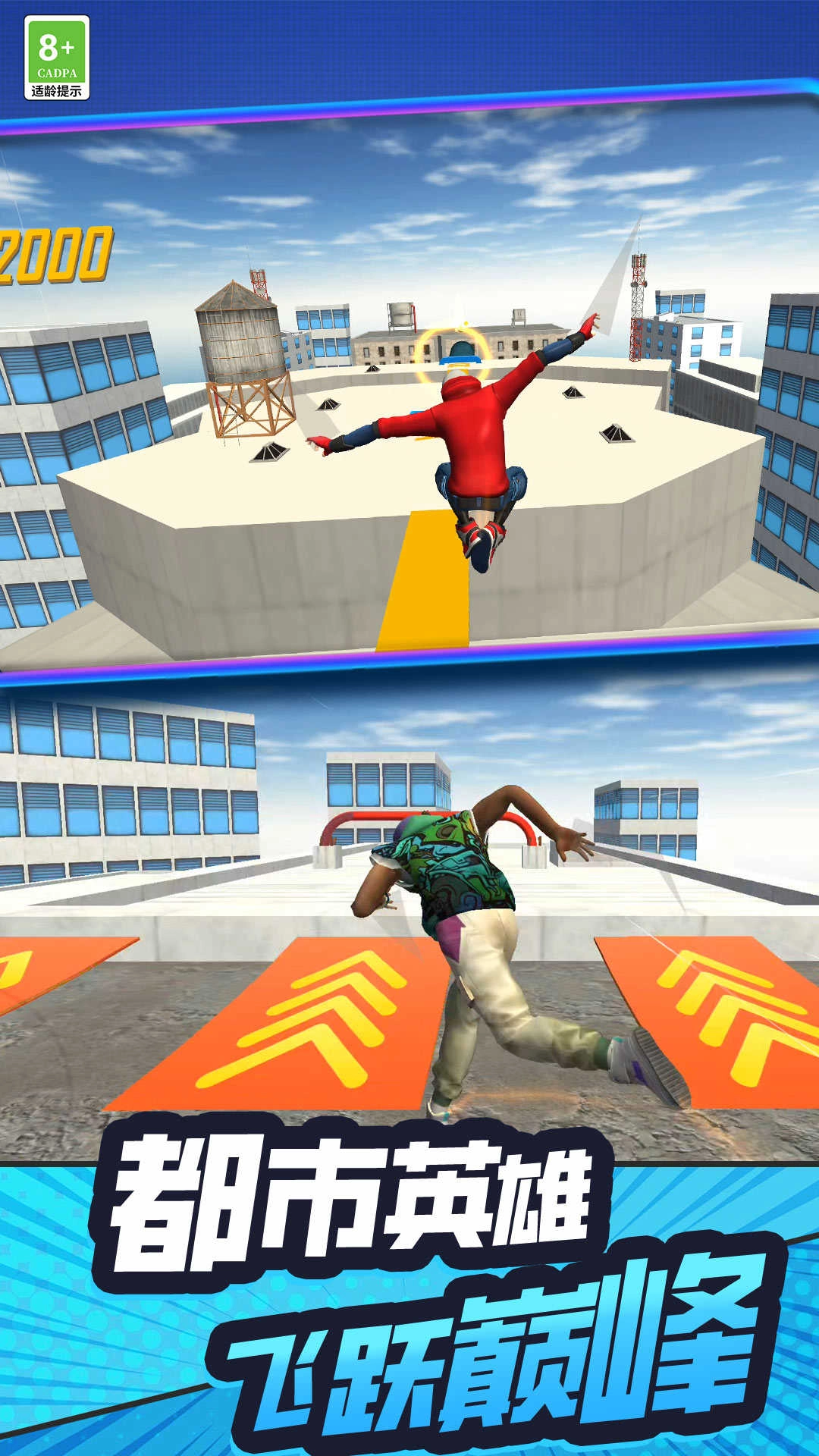 在高低错落、间距各异的屋顶平台之间来回跳跃,沿途收集金币。碰到特色道具还能获得短暂的加速或护盾效果。
