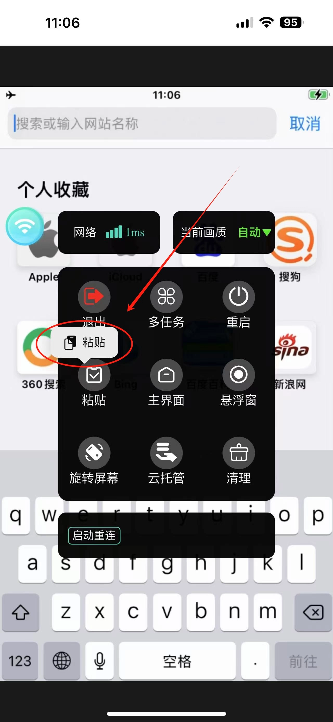 点击左侧的WiFi标志,点击粘贴。