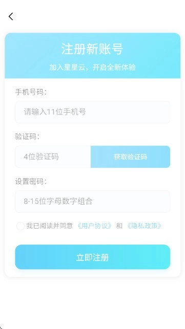 打开应用后,在登录页面输入手机号与密码,勾选“已阅读并同意星星云用户协议及隐私协议”,点击“登录”按钮就能进入系统。要是还没注册,可以点击“立即注册”;如果忘记密码,则可点击“忘记密码”选项。