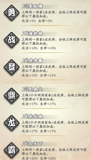 首先来看看武将阵营的光环系统,其中最强的当属六个同阵营武将触发的“六合天下光环”。不过,小飞飞不建议大家在游戏前期就强行凑这个光环羁绊——毕竟前期同阵营武将数量有限,反而更推荐属性同样出色的“三足鼎立光环”,这样能让前期武将更好地配合,帮助我们最大化获取前期资源。