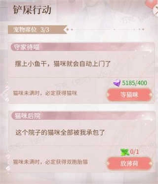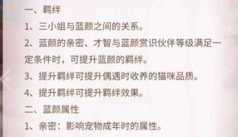 宠物的获取途径是蓝颜偶遇,其品质与蓝颜的羁绊等级挂钩,因此前期建议重点提升单个蓝颜的羁绊等级,以获取品质更优的宠物。此外,蓝颜的亲密度也会对猫咪成年后的属性产生影响。