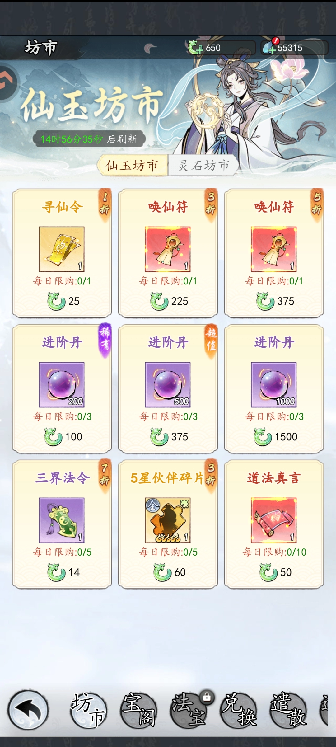 仙玉坊市的寻仙令、唤仙符、道法真言和进阶丹是必买品;灵石坊市的物品可根据自身情况酌情选购。