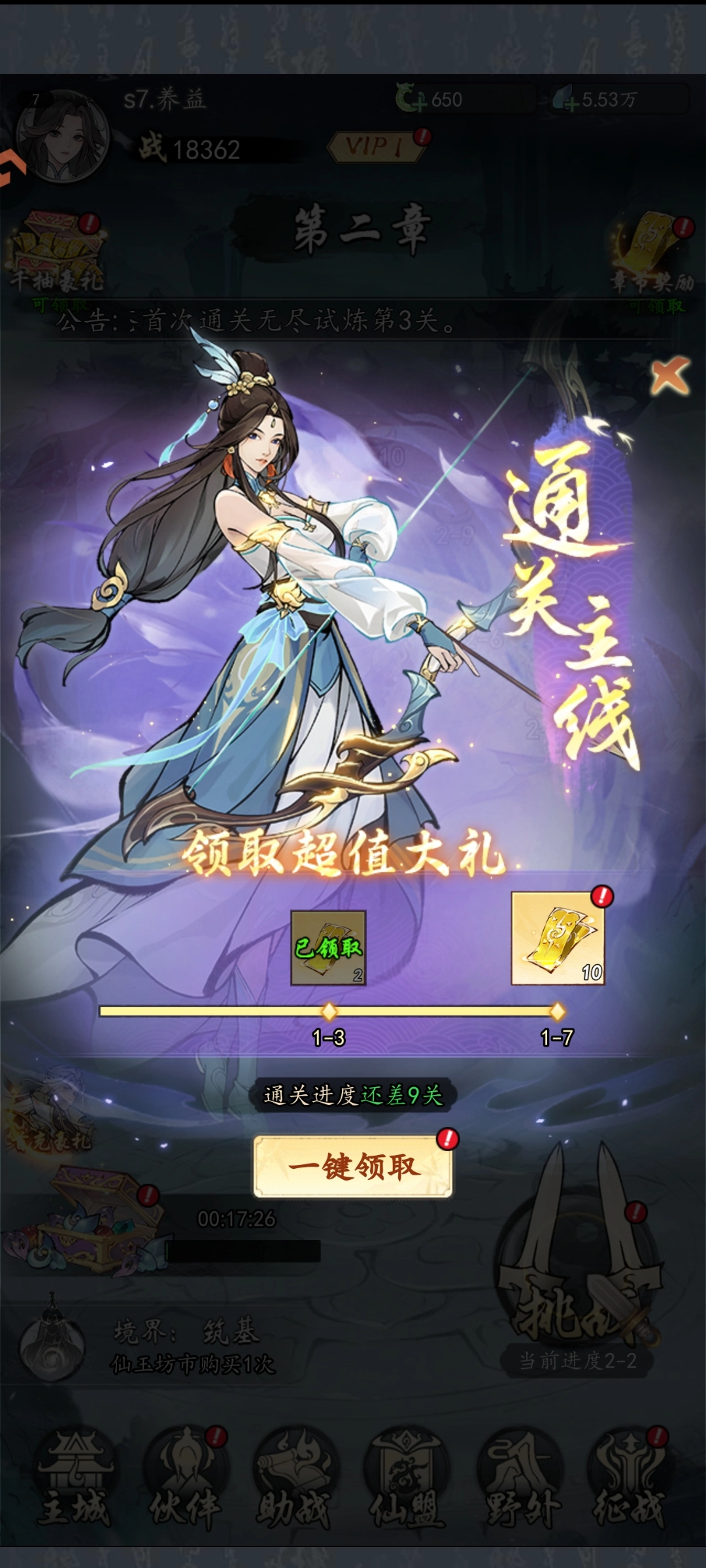 想要快速解锁关键功能,前期得优先把新手引导任务做完,通过快速推进关卡来提升收益,这样就能解锁飞升之路、伙伴、仙盟、野外试炼这些核心系统了。