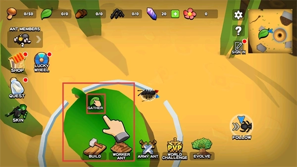 2、通过滑动屏幕来控制蚂蚁移动,等蚂蚁走出洞穴后,按照指引找到并点击GATHER按钮以获取叶片。
