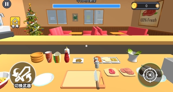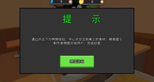 3、点击下方两侧的按钮,让中心点与桌上的食材进行交互,再按照提示制作食物并提交给顾客,以此完成经营任务。