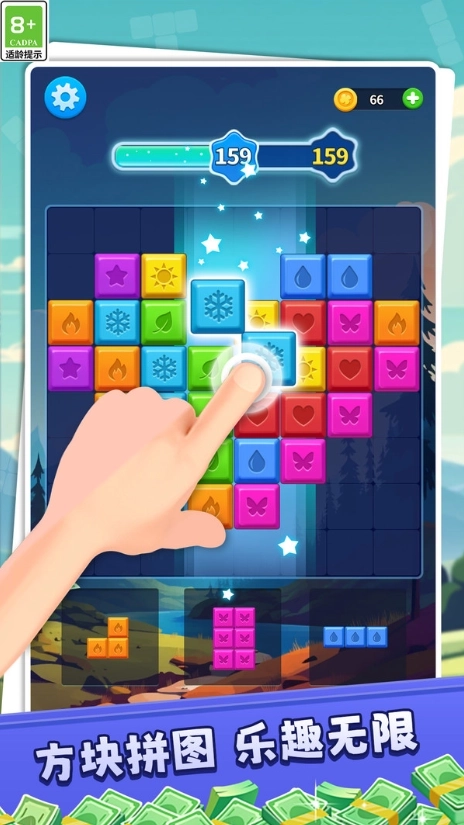 2、游戏启动后,不同形状的方块会从屏幕顶端下落,玩家可通过手指触控来灵活调整方块的位置和朝向,让它们能够填满横向的一整行。
