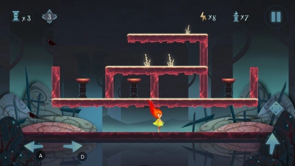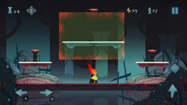 首先我们可以先按住右侧屏幕的菱形按钮开启红色隐藏区域,在屏幕中间向左滑动,就能找到隐藏在屏幕左侧的灯台,然后按住控制键跳上平台将它们点燃;右侧灯台的点燃方式也是如此。另外,千万别忘了屏幕中间最高点还有一个灯台!可以借助点燃第一个灯台时的平台跳上去将它点燃就好啦!